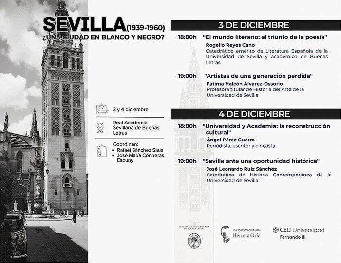 Los días 3 y 4 de diciembre de 2025 se celebraron unas jornadas en la Real Academia Sevillana de Buenas Letras con el título Sevilla (1939-1960): ¿una ciudad en blanco y negro?, que se sumaron a una serie de actividades de la Fundación Cultural Herrera Oria para reivindicar la producción cultural de aquellos años. Las jornadas se abrieron con una conferencia a cargo de Rogelio Reyes Cano, catedrático emérito de Literatura Española de la Universidad de Sevilla, en la que trazó un retrato de una época que él conoció de primera mano. Le siguió la profesora Fátima Halcón, que rescató la figura de una serie de artistas, especialmente pintores, de la Sevilla entonces.